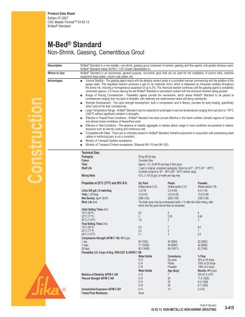 M-Bed Standard is an economical general purpose non-shrink grout that can be used for the installation of anchor bolts machine equipment base plates column sole plates etc. Sika Canada Inc. Based on 3 litres of water per bag Plastic mix After full 28 day curing approx 65 MPa.
